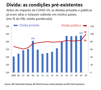 Nas economias avançadas e em algumas economias de mercado emergentes, as compras de dívida do governo pelo banco central ajudaram a manter as taxas de juros em mínimos históricos e apoiaram os empréstimos do governo. Nessas economias, a resposta fiscal à crise foi massiva. Em muitos mercados emergentes altamente endividados e economias de baixa renda, no entanto, os governos tiveram espaço limitado para aumentar os empréstimos, o que prejudicou sua capacidade de ampliar o apoio aos mais afetados pela crise. Esses governos enfrentam agora escolhas difíceis. Por exemplo, em 2020, a dívida do governo chegará a mais de 480% de sua receita nos 35 países da África Subsaariana elegíveis.