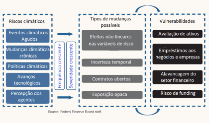 Esses riscos climáticos se apresentam em vários horizontes. A figura abaixo ilustra como os riscos ecológicos se transformam em riscos para a estabilidade financeira. Riscos agudos, tais como tempestades, inundações, secas ou incêndios florestais, podem alterar rapidamente ou revelar novas informações sobre as condições econômicas futuras ou o valor de ativos reais ou financeiros. Além disso, na presença de mudanças rápidas nas percepções públicas de risco, os perigos crônicos (como um aumento lento no nível do mar) têm o potencial de produzir eventos de reprecificação abrupta semelhantes. Esses eventos de reprecificação e perdas diretas associadas a riscos climáticos podem resultar em um aumento da frequência e gravidade dos choques financeiros; o momento e as repercussões desses choques são difíceis de prever com antecedência.