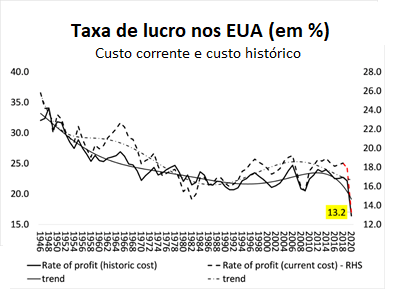 Mas os austríacos estão certos ao afirmar que o aumento contínuo do capital fictício, em vez da elevação do investimento em capital produtivo, está lançando as bases para uma grande quebra no futuro, caso a recuperação econômica vacile. Uma vez que um usuário de drogas se tornou costumeiro, fica difícil de lhe tirar o vício, ao passo que lhe dar um “peru frio” pode matá-lo imediatamente. Como Plender asseverou: “O imperativo deveria ser antes garantir que a explosão da dívida pós-pandemia encontre um caminho para o investimento produtivo”. Exatamente, mas como isso pode ser feito se os capitalistas não querem investir produtivamente? O que decide o nível de investimento produtivo é sua lucratividade em comparação com o “rendimento” possível da especulação no mercado de ações e títulos que foi gerado pelo QE. Veja-se, pois, a evolução da taxa de lucro nos EUA no gráfico em sequência.