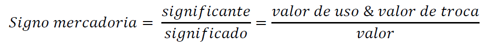 Antes disso é preciso fazer alguns esclarecimentos. Se a mercadoria é valor e não-valor, ou seja, a contradição entre valor e valor de uso, ela aparece no mercado como valor de uso e valor de troca. Enquanto valor de uso ela consiste de algo que tem uma materialidade natural, mas enquanto valor, a sua materialidade é puramente social, ou seja, da ordem do significado – de um significado posto objetivamente no funcionamento do sistema econômico. O valor aparece sob a forma de valor de troca; o valor é o conteúdo do valor de troca. Tomando a mercadoria com um signo, pensado de um modo materialista –, tem-se: