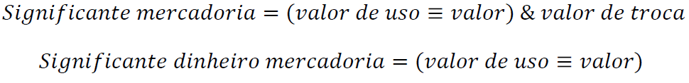 Se a mercadoria é a forma elementar do valor; o dinheiro é a forma geral do valor no modo de produção capitalista. O valor, portanto, é aí a essência abstrata da riqueza; esta, portanto, se manifesta em ambas essas formas – ainda que diferentemente: como forma relativa na mercadoria e como forma equivalente no dinheiro. Essas duas formas, em última análise, são formas da relação social de troca – mediações da relação de capital. O próprio valor, portanto, é por excelência forma das relações sociais que constituem esse modo de produção. Note-se, agora, que há uma maneira sintética de apresentar tudo isso; eis que ela separa por uma barra a aparência da essência da mercadoria: