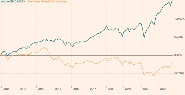 Índice All-World versus índice Dow Jones Global Oil & Gas: últimos 10 anos (dados de mercado do Financial Times)