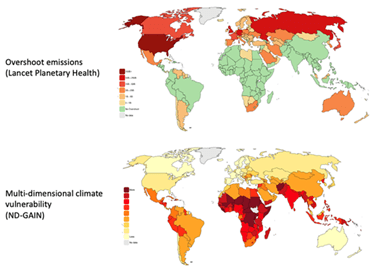 Os países do Norte global (Europa, Estados Unidos, Canadá, Austrália, Nova Zelândia, Israel e Japão) são responsáveis por 92% do total de emissões que estão causando o colapso climático. Enquanto isso, o Sul Global – todos os continentes da Ásia, África e América Latina – são responsáveis por apenas 8% do “excesso de emissões”. E a maioria desses países ainda está dentro de suas cotas relativas ao limite de emissões, incluindo Índia, Indonésia e Nigéria. Para piorar as coisas, os impactos do colapso climático recaem desproporcionalmente nos países do Sul global, que sofrem a grande maioria dos danos e mortalidade induzidos pelas mudanças climáticas dentro de suas fronteiras.