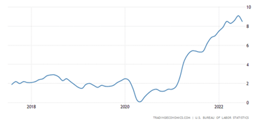 O pivô impediria que as taxas de juros subissem demais e, assim, sustentasse o mercado de ações e a economia. Afinal, a taxa de inflação homóloga dos EUA diminuiu um pouco em agosto, de uma alta de 9,1% para 8,5%; e ficou confirmado que o PIB real caiu no primeiro semestre de 2022, enquanto os gastos do consumidor estão desacelerando. Assim, os sinais de recessão aumentaram e, talvez, os EUA já estejam nessa situação há algum tempo. Eis o gráfico do índice de preços ao consumidor nos EUA: