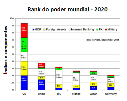 Os EUA estão preocupados com a ascensão da economia chinesa, embora o poder dos EUA vá muito além daquilo que uma simples medida econômica poderia sugerir. Uma olhada no índice de poder dos principais países nas últimas duas décadas mostra como a China também construiu algumas dimensões de poder não relacionadas ao PIB, principalmente em gastos militares, bancos internacionais e propriedade de ativos de investimento estrangeiro.