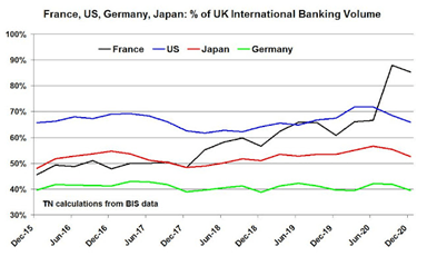 No entanto, o Brexit teve algum impacto na liderança dos bancos internacionais do Reino Unido. Com o Reino Unido fora do mercado de serviços financeiros na União Europeia (UE), alguns bancos mudaram suas operações dele para outros centros da UE. A França ganhou mais terreno por causa dessa ocorrência e saltou para o segundo lugar logo atrás do Reino Unido, no final de 2020, passando à frente dos EUA, que estavam em terceiro lugar (veja o próximo gráfico).