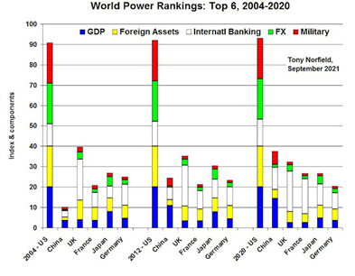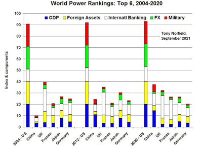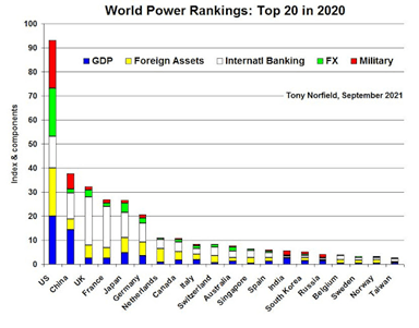 Nos últimos anos, a China desalojou o Reino Unido do segundo lugar neste ranking de potência mundial. O Reino Unido é a quinta maior economia do mundo, mas tem seu status impulsionado por seu papel no setor bancário internacional. Isso reflete sua posição nas finanças mundiais, embora a forma que isso assume também esteja mudando com a ascensão da China e outros países asiáticos e o declínio relativo das economias europeias. Quanto mais os negócios internacionais crescem fora do grupo tradicionalmente dominante de países, menos importantes são as regras que eles impõem sobre como a economia mundial deve funcionar.