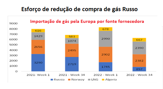 Esse resultado foi obtido por meio de importações mais caras de gás natural liquefeito (GNL), as quais são trazidas por navios. A Europa reduziu suas importações de gás da Rússia (em parte por razão política, mas principalmente porque a Rússia reduziu o fornecimento de gás para 20% no gasoduto principal – e agora esta semana para zero). Para substituir essa perda, comprou GNL da Espanha e da América do Norte.