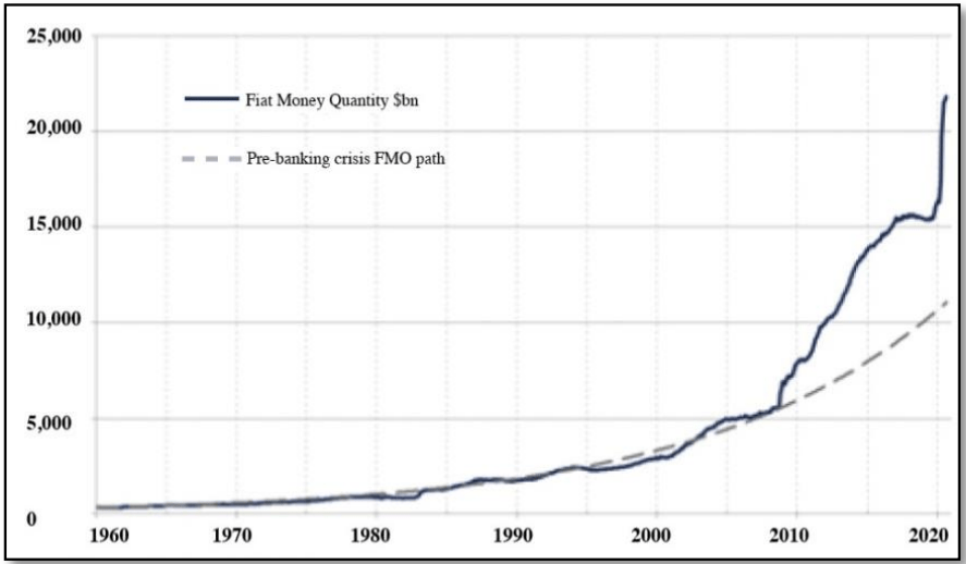 A maioria dos governos em todo o mundo aprovou pacotes que envolviam a mesma combinação de estímulo fiscal, resgate corporativo e modesto alívio público, se é que foi fornecido (FMI, 2021). Reciclada em mais atividades especulativas, a injeção de financiamento estatal no sistema financeiro global durante a pandemia expandiu ainda mais a lacuna entre a economia produtiva e o capital fictício, pois as bolhas mantiveram a economia capitalista à tona. A figura apresentada abaixo mostra o crescimento do dinheiro fiduciário medido nos Estados Unidos, indicando o pico acentuado a partir de 2008 e, em seguida, um pico quase vertical com o início da pandemia.