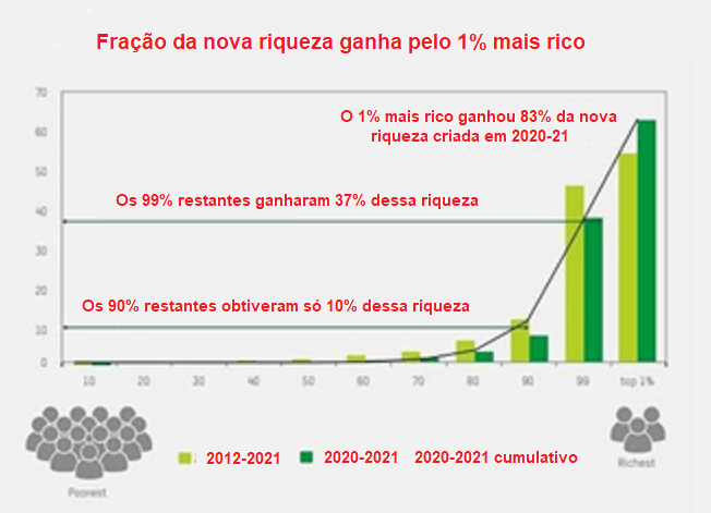 Todos os anos, para coincidir com a reunião do WEF, a Oxfam divulga seu relatório anual sobre desigualdade; assim, expõe também a hipocrisia do “capitalismo das partes interessadas”. O relatório deste ano mostrou o aumento da desigualdade de riqueza e renda desde a pandemia. “Nos últimos dois anos, o 1% dos super-ricos do mundo ganhou quase o dobro da riqueza dos 99% restantes juntos” – disse a Oxfam.
