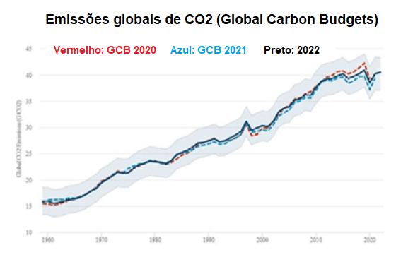 As emissões globais de dióxido de carbono de combustíveis fósseis e cimento aumentaram 1,0% em 2022, atingindo um novo recorde de 36,6 bilhões de toneladas de CO2 (GtCO2). As emissões “estão aproximadamente constantes desde 2015” devido a um modesto declínio nas emissões do uso da terra, equilibrando aumentos modestos no CO2 fóssil. Mas lembre-se, níveis estáveis de emissão não são suficientes para impedir que o mundo continue aquecendo além dos limites oficiais. É necessária, no mínimo, uma redução de 50% nas emissões até o final desta década e zero emissões até o final do século.