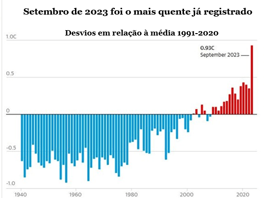 Comecemos pelo clima e pelo aquecimento global. As temperaturas globais atingiram um novo recorde em setembro; subiram acima do valor histórico por enorme margem. Cientistas do Copernicus Climate Change Service vem dizendo que 2023 está a caminho de ser o ano mais quente já registrado na história. A temperatura média global em setembro foi 1,75°C mais quente do que a média registrada entre 1850-1900, período ainda pré-industrial, após o qual as mudanças climáticas induzidas pelo homem começaram a ocorrer e a produzir efeitos.