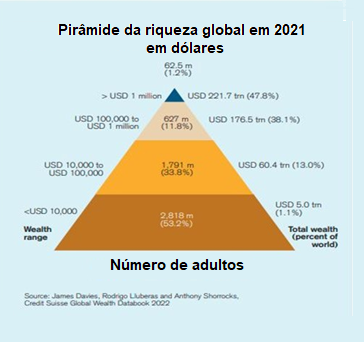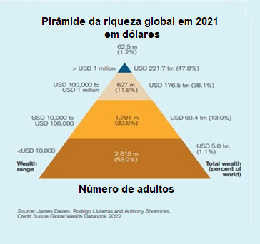 E depois há desigualdade de riqueza e de renda. O último relatório do Credit Suisse sobre a riqueza pessoal global mostrou que, em 2022, 1% dos adultos (isto é, 59 milhões de pessoas) possuía 44,5% de toda a riqueza pessoal do mundo, um pouco mais do que antes da pandemia em 2019. No outro extremo da riqueza pirâmide, os 52,5% mais pobres da população mundial (2,8 bilhões de pessoas) tinham uma riqueza líquida de apenas 1,2%.