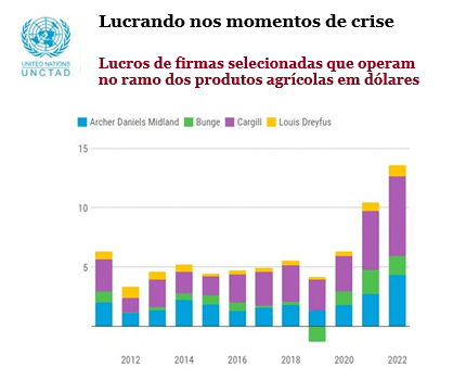 A desigualdade de riqueza e renda é a contrapartida de um sistema econômico voltado para o lucro e não para o atendimento das necessidades dos povos. Num relatório da UNCTAD lê-se que “durante o período de elevada volatilidade dos preços desde 2020, algumas grandes empresas de comércio de alimentos obtiveram lucros recordes nos mercados financeiros, mesmo quando os preços dos alimentos dispararam globalmente e milhões de pessoas enfrentaram uma crise de custo de vida”. O gráfico abaixo mostra isso de forma iniludível: