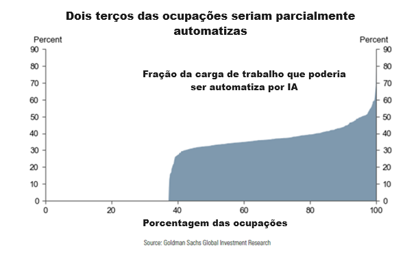 Advogados e pessoal administrativo estariam entre os que correm maior risco de serem demitidos (assim como, provavelmente, os economistas!). Eles calcularam que cerca de dois terços dos empregos nos EUA e na Europa são passíveis em algum grau de serem automatizados por meio de IA. Chegaram a tal conclusão com base em dados sobre as tarefas normalmente executadas em milhares de ocupações.