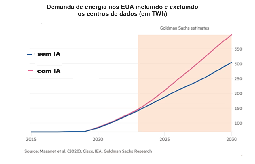 A consultoria Grid Strategies prevê um crescimento da demanda de eletricidade dos EUA de 4,7% nos próximos cinco anos, quase dobrando sua projeção em relação ao ano anterior. Um estudo do Electric Power Research Institute descobriu que os “data centers” representarão 9% da demanda de energia dos EUA até 2030, mais do que o dobro dos níveis atuais.