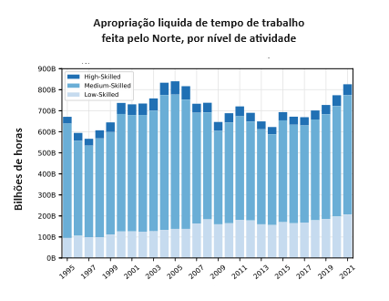 Essa apropriação líquida ocorre em todas as categorias de habilidades, incluindo trabalho altamente qualificado. Em média, o Norte importa 4 vezes mais trabalho altamente qualificado do Sul do que exporta, juntamente com 17 vezes mais trabalho de qualificação média e 29 vezes mais trabalho pouco qualificado.