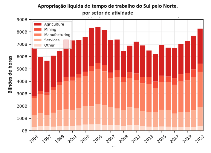Aqui isso é avaliado empiricamente medindo os fluxos de trabalho incorporado na economia mundial de 1995 a 2021, levando em conta os níveis de qualificação, setores e salários. Descobrimos que, em 2021, as economias do Norte global se apropriaram de 826 bilhões de horas de trabalho incorporado do Sul global, em todos os níveis de qualificação e setores.
