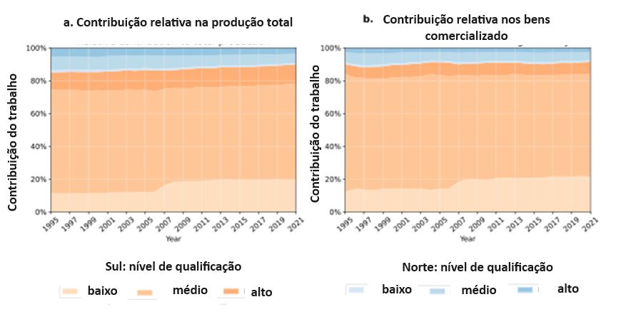 Na figura acima apresentada, mostramos as contribuições relativas do trabalho (horas) para a produção global por região e nível de qualificação, entre 1995 e 2021. A área azul indica o trabalho prestado por trabalhadores no Norte global, enquanto a área laranja indica trabalho prestado por trabalhadores no Sul global. Os níveis de habilidade são sombreados de mais claro (pouco qualificado) a mais escuro (alto qualificado). O painel da esquerda (a) mostra a contribuição para a produção total de todos os bens e serviços. O painel da direita (b) mostra apenas as contribuições para a produção de bens e serviços comercializados.