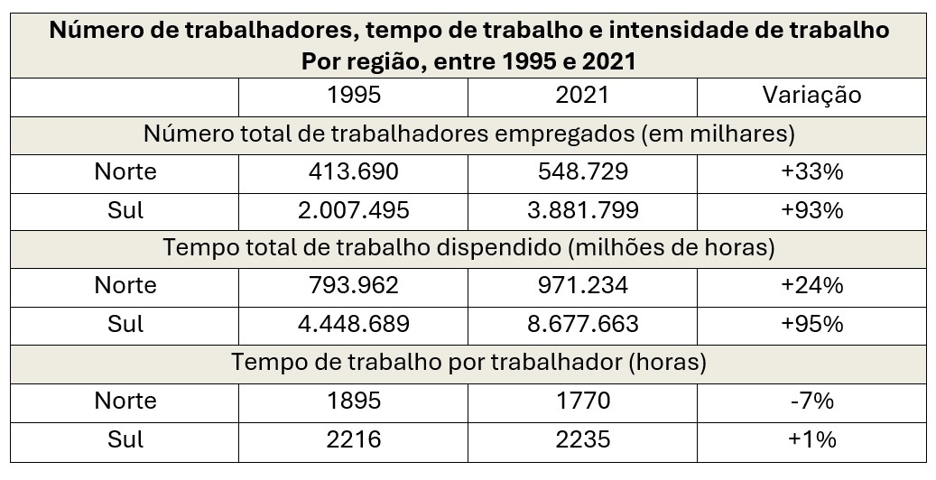 A Tabela em sequência mostra que o número total de trabalhadores empregados e o número total de horas trabalhadas aumentaram tanto no Norte quanto no Sul de 1995 a 2021, com o aumento substancialmente maior no Sul global.