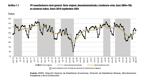 O quadro é o mesmo para a indústria. A produção industrial recuperou durante três meses, de julho a setembro, face ao mês anterior. Mas o seu nível em setembro de 2024 continua a ser 6,1 % inferior ao de setembro de 2023. Pior ainda, o nível de produção acumulado nos primeiros nove meses do ano é 12,7% inferior ao de 2023. Em suma, parece que a economia argentina está a começar a estabilizar-se num nível extremamente baixo e, em qualquer caso, mais baixo do que no final do governo anterior.