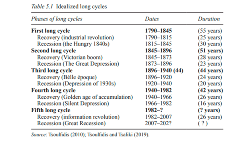 Os autores descobriram que houve cinco ondas longas ou ciclos K abrangendo 187 anos de desenvolvimento capitalista nos Estados Unidos e no Reino Unido, de 1834 a 2021.