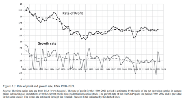 Os autores argumentam que “Para Marx, as crises no capitalismo têm causas intrínsecas e, portanto, não são conjecturas; Nesse sentido, eles são inevitáveis.” A evolução da economia americana segue o esquema teórico de Kondratiev e o movimento da taxa de lucro inevitavelmente a moldou durante o período pós-Segunda Guerra Mundial.