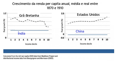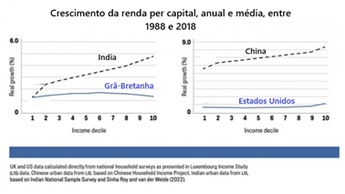 O contraste é mostrado nas duas figuras que apresentadas. Na primeira (acima), que mostra dados para o período de 1870 a 1910, todas as partes da distribuição dos países ricos cresceram mais rápido do que todas as partes da distribuição dos países pobres. Na segunda figura (abaixo), que mostra dados de 1988 a 2018, as taxas de crescimento de todas as partes da distribuição de renda na China e na Índia excedem as de todas as partes da distribuição de renda nos Estados Unidos e no Reino Unido.