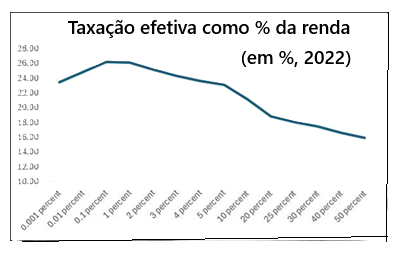 Isso é parte da razão pela qual as pessoas mais ricas dos EUA acabam pagando taxas de imposto efetivas mais baixas do que as pessoas que se situam em categorias de renda mais baixas. Os ganhos de capital e dividendos não são tributados ou são tributados a uma taxa muito mais baixa. A Figura 2 mostra o perfil da taxação efetiva em 2022.