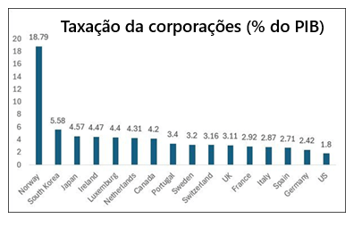 Como resultado, em 2022, os impostos corporativos como parcela da renda total se mostraram mais baixos nos EUA em comparação com os países de alta renda da OCDE. Se chegou a 18,8% do PIB na Noruega, não passou de apenas 1,8% do PIB nos Estados Unidos da América do Norte.