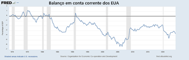 Agora, você mencionou algumas vezes que os EUA realmente dependem das exportações de petróleo e do controle do comércio de petróleo, em parte para tentar reduzir o seu enorme déficit em conta corrente. Mas, como o gráfico em sequência mostra bem, isso não tem acontecido. Os EUA têm enormes déficits em conta corrente – isto é, déficits comerciais com o resto do mundo.