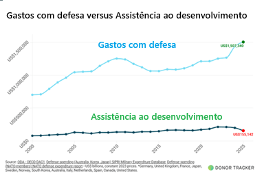 O próximo ano marcará o terceiro ano consecutivo de declínio nos gastos com ajuda do G7 – uma tendência não vista desde a década de 1990. Se esses cortes forem adiante, os níveis de ajuda do G7 em 2026 cairão em US$ 44 bilhões, para apenas US$ 112 bilhões. Os cortes estão sendo impulsionados principalmente pelos EUA (queda de US$ 33 bilhões), Alemanha (queda de US$ 3,5 bilhões), Reino Unido (queda de US$ 5 bilhões) e França (queda de US$ 3 bilhões).