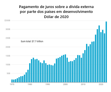Dados recentes do órgão de comércio e desenvolvimento da ONU, UNCTAD, revelam que 54 países gastam mais de 10% de suas receitas fiscais apenas no pagamento de juros. A carga média de juros para os países em desenvolvimento, como parcela das receitas fiscais, quase dobrou desde 2011. Mais de 3,3 bilhões de pessoas vivem em países que agora gastam mais com o serviço da dívida do que com saúde, e 2,7 bilhões em países que gastam mais com dívidas do que com educação.