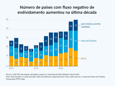 Os pagamentos da dívida são agora maiores do que os novos fluxos de crédito e capital. Em 2023, os países de baixa e média renda (excluindo a China) experimentaram uma saída líquida para o setor privado de US$ 30 bilhões em dívidas de longo prazo – um grande dreno para o desenvolvimento. Desde 2022, os credores privados estrangeiros extraíram quase US$ 141 bilhões a mais em pagamentos do serviço da dívida de mutuários do setor público em economias em desenvolvimento do que desembolsaram em novos financiamentos. Por dois anos consecutivos, os credores externos das economias em desenvolvimento estão retirando mais do que colocando.