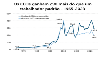 O potencial para autonegociação sempre foi óbvio. Ainda assim, na década de 1960, os CEOs recebiam “apenas” cerca de 20 vezes mais do que seus trabalhadores. Desde então as coisas, bem, mudaram. Em sequência, apresenta-se um gráfico que mostra a proporção entre o salário do CEO e os ganhos dos trabalhadores típicos: