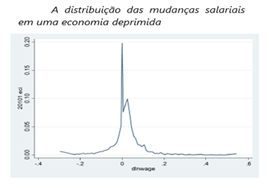 Como se vê no gráfico acima posto, houve um grande pico em zero: eis que muitos trabalhadores não receberam aumento salarial. Mas quase nenhum enfrentou um corte salarial real. Por quê?