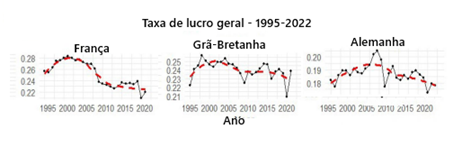 A figura abaixo ilustra o movimento da taxa geral de lucro. (…) Notavelmente, há um claro declínio na taxa geral de lucro na França e na Alemanha. Na Grã-Bretanha, a tendência de queda observada nos anos pós-2007 parece ter se estabilizado durante os anos excepcionais da pandemia e das guerras recentes, durante as quais os governos aumentaram suas demandas por meio de seus gastos e fornecimento de subsídios.