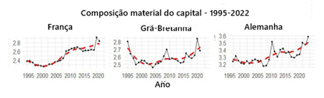 A figura em sequência apresenta a composição em valor do capital (CVC) nas três economias europeias. Observa-se que a CVC apresenta uma tendência ascendente em todos os três países (…) a partir do início dos anos 2000. Ora, essa observação é uma das descobertas mais robustas do estudo.