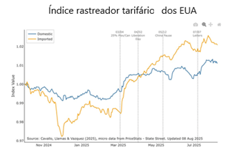 Há também evidências estatísticas preliminares de que está ocorrendo um aumento significativo nos preços de varejo de produtos importados. O gráfico abaixo mostra os preços dos produtos domésticos (linha azul) e dos importados (linha laranja) nos principais varejistas (o valor 1 foi atribuído ao 1º de outubro de 2024).