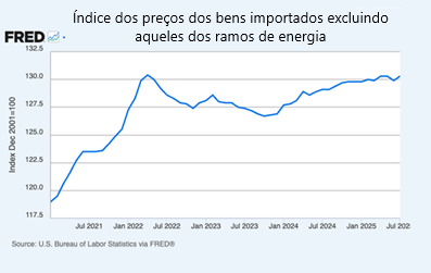 Ora, o Bureau of Labor Statistics coleta dados sobre os preços pagos pelas importações, sem incluir tarifas. O seu índice de preços de importação disparou durante as interrupções na cadeia de suprimentos em 2021-22; diminuiu em sequência à medida que as cadeias de suprimentos foram reconstituídas; agora, começou a subir novamente (veja-se o gráfico em sequência). Parou de diminuir desde que as tarifas de Trump entraram em vigor; ora, isso mostra que os exportadores estrangeiros não estão pagando as tarifas, como se poderia esperar.