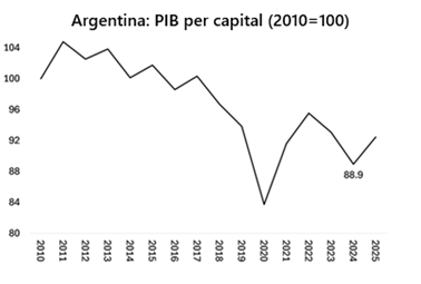 Dado a valorização do peso, a indústria argentina perdeu capacidade de competição; em consequência, o investimento doméstico foi desestimulado. Nos últimos seis trimestres (do 2º trimestre de 2024 ao 2º trimestre de 2025), a relação investimento/PIB teve uma nova baixa média de 15,9%. As taxas de investimento são baixas porque a rentabilidade do capital investido na Argentina está em um nível muito baixo, tão baixo como nunca esteve antes.