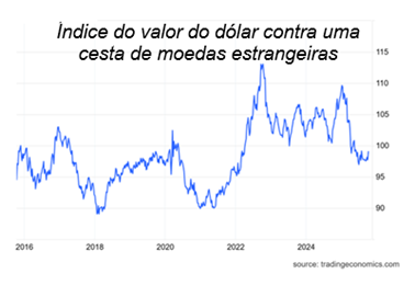 Então, aconteceu o início do governo Trump. As suas birras tarifárias passaram a criar uma enorme incerteza sobre os rumos do comércio global e, em particular, sobre o que acontecerá na economia dos EUA. Eis que ainda, ademais, não ficou claro quais são as intenções do governo Trump: ele quer um dólar que permanece forte para manter os preços de importação estáveis ou ele quer enfraquecê-lo para impulsionar as exportações dos EUA? Nesse quadro de incerteza, o ouro se tornou ainda mais atraente. O valor do dólar americano em relação a outras moedas caiu mais de 10% nos primeiros seis meses da presidência de Trump.