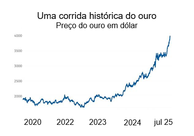 Esta semana, o preço do ouro em dólares americanos atingiu US $ 4.000 por onça-troy (que equivale a 24,3 gramas de ouro). Esta é uma alta histórica (pelo menos em dólares nominais). Mas mesmo essa alta parece destinada a ser superada. O banco de investimento Goldman Sachs prevê que chegará a um valor de US $ 4.900 por onça-troy até o final do ano. Note-se que preço do ouro em outras moedas importantes também tem se elevado.