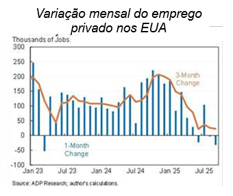 E agora há sinais de que o setor de serviços em geral também está com problemas. O índice dos gerentes de compra (conhecido como PMI) relativo aos serviços do ISM (um instituto de pesquisa econômica) caiu de 52 em agosto para 50 em setembro de 2025. Ficou bem abaixo das previsões, sinalizando que o setor de serviços estagnou.