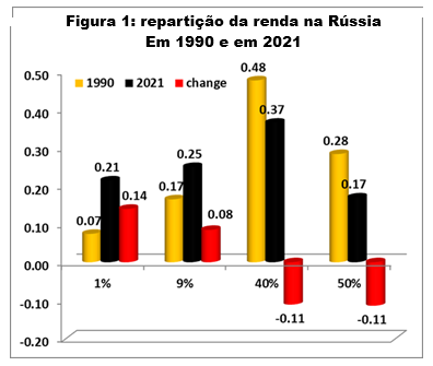 Até 2021, essa proporção experimentou uma tendência de declínio, mas em 2021 ainda vem a ser 63 vezes a renda média dos 50% mais pobres da Rússia. É verdade que, em comparação com 2001, há alguma melhoria, mas em comparação com 1990, esse rácio ou esta diferença de rendimentos é cerca de 5 vezes maior.