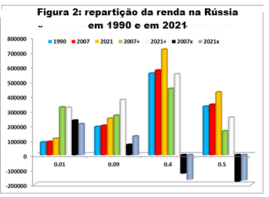Pode-se expressar essas mudanças em dólares: em 1990, os 10% mais ricos da população recebiam US$ 278 bilhões da renda nacional total da Rússia e o restante ficava com US$ 883 bilhões; esse montante, era distribuído entre os 90% da população. Se dividirmos o período entre 1990 e 2021 em dois subperíodos, 1990-2007 e 2007-2021, surge um quadro interessante.