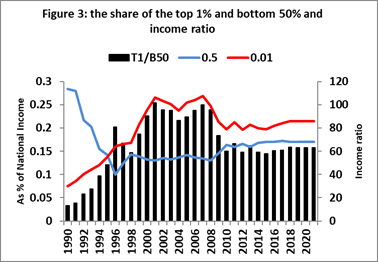 Examina-se agora a situação de diferentes grupos de renda nesta situação volátil e mutável na Rússia. Examinamos a parcela do 1% superior e dos 50% mais pobres e a taxa de renda entre a renda média desses dois grupos na Figura 3, também sequência.