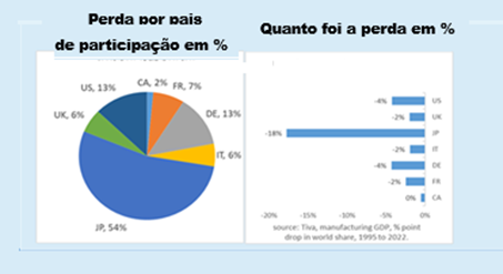 O painel à direita mostra as quedas percentuais na participação global por país. O Canadá foi o que menos perdeu em termos de participação, passando de 1,8 em 1995 para 1,3 em 2022.