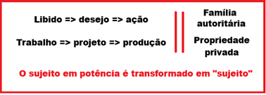 A libido, por meio do desejo, pode em princípio se converter numa ação realizadora centrada daquele que se configura, então, como sujeito. Contudo, na sociedade de classe o homem não pode ser um sujeito pleno que se autodetermina como ser social e que luta livremente para realizar aquilo que deseja; ao contrário, ele tem de permanecer como um ser reprimido, como alguém estruturalmente insatisfeito, que se tornou capaz de trabalhar para outrem, tornando-se, assim, um assujeitado e, possivelmente, um explorado.