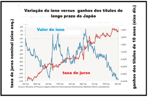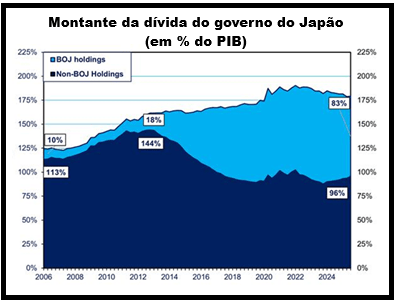 Primeiros-ministros vão e vêm: de Abe a Kishida e a Ishiba, mas nada muda. O governo do Japão tem mantido déficits permanentes, gastando em construção e outros projetos, mas ainda assim a economia japonesa continua estagnada. Com o setor corporativo japonês relutante ou incapaz de investir, Takaichi agora tenta acabar com a estagnação do Japão por meio de gastos fiscais, cortando as taxas de juros e permitindo que o iene se deprecie para impulsionar as exportações. Trata-se de uma política do tipo Truss-Trump que tem deixado o Banco do Japão e as instituições financeiras muito preocupados, assim como investidores estrangeiros.